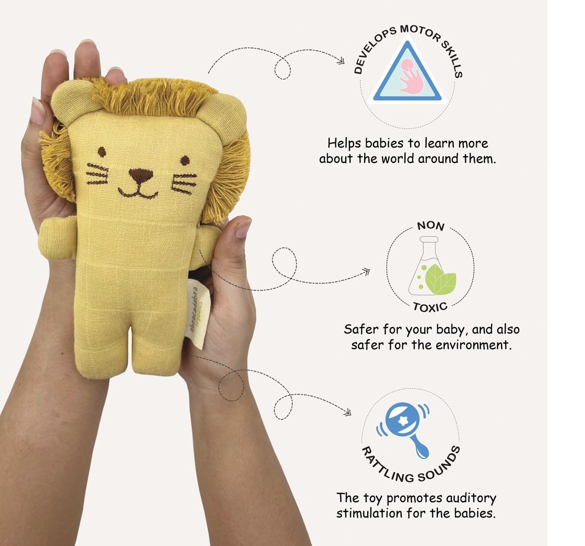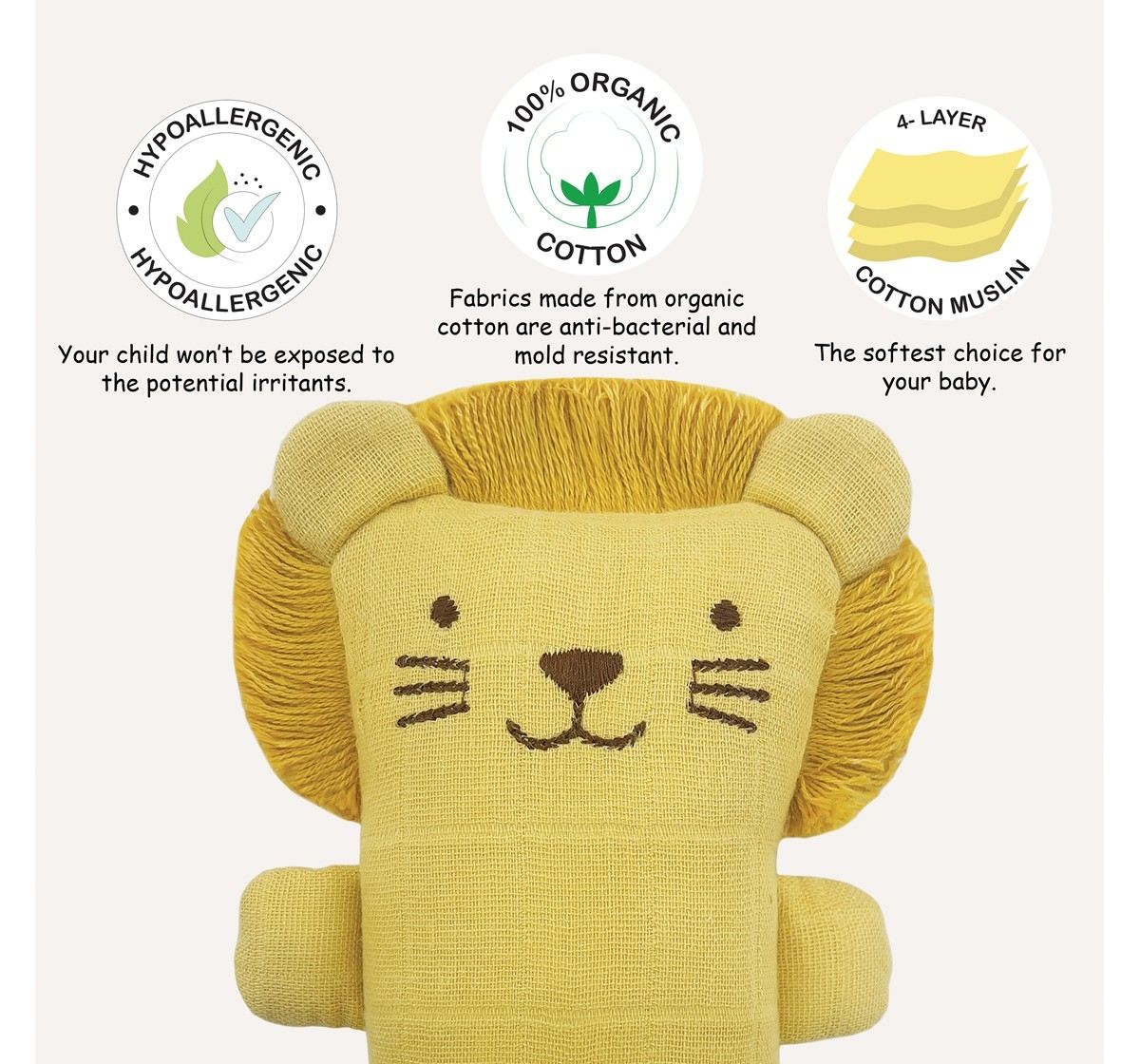 - 4 layers of 100% organic cotton muslin are used for extra softness and luxury. The cuddle toy helps develop the baby’s hand-eye coordination and motor skills. It engages your baby with discernible patterns, rattling sounds, and fun animal shapes.