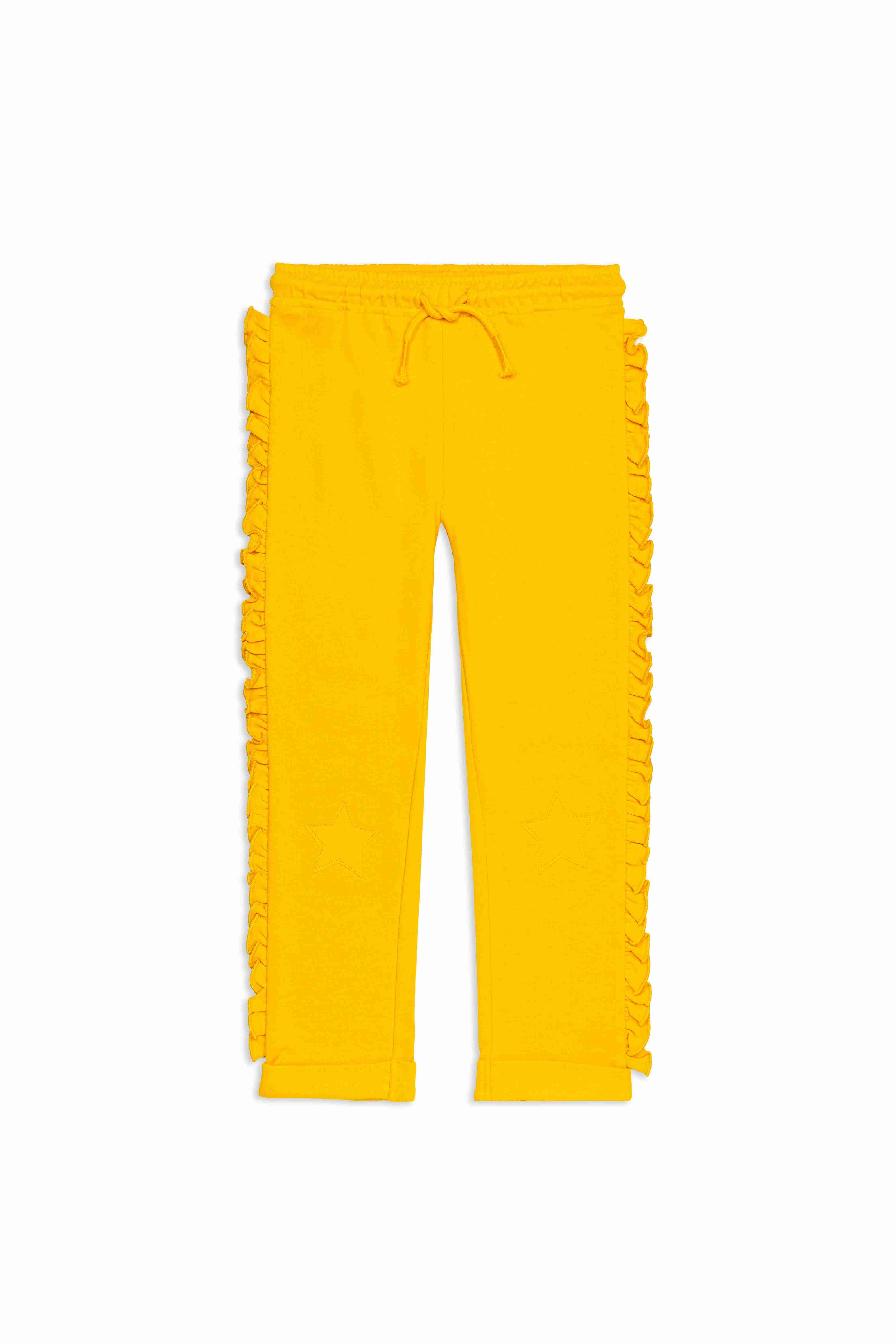 High on style & comfort, our vibrant yellow jogger is sure to brighten up your little girl. Fun and functional, this jogger features adorable frill detail at sides and has a stretchy waist with tie cords for an all day comfy fit. It has a star patchwork on knees & ribbed ankle cuffs for a snug fit. Mix and match joggers with tshirts or sweats and a pair of trainers for a trendy look. Buy now!
