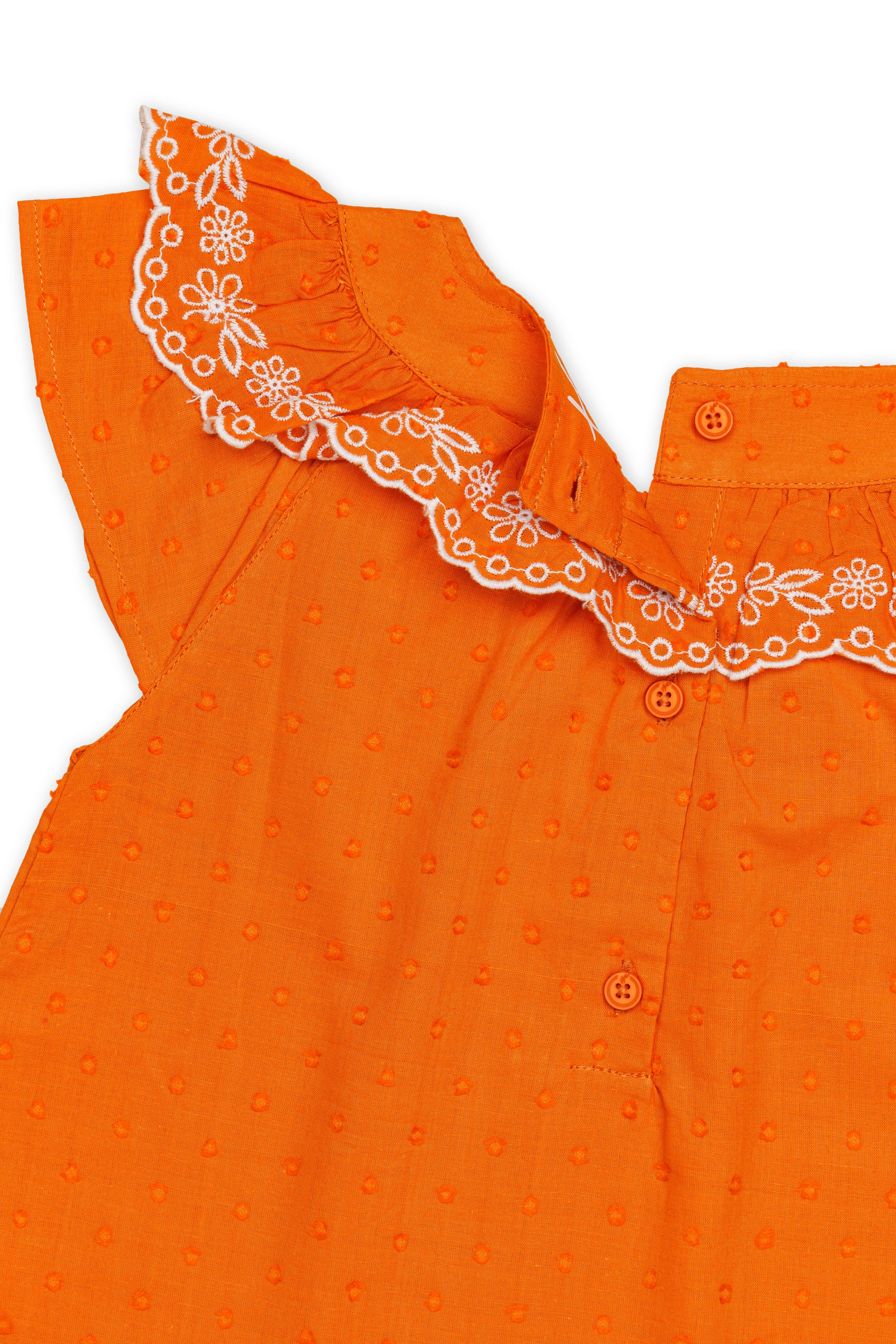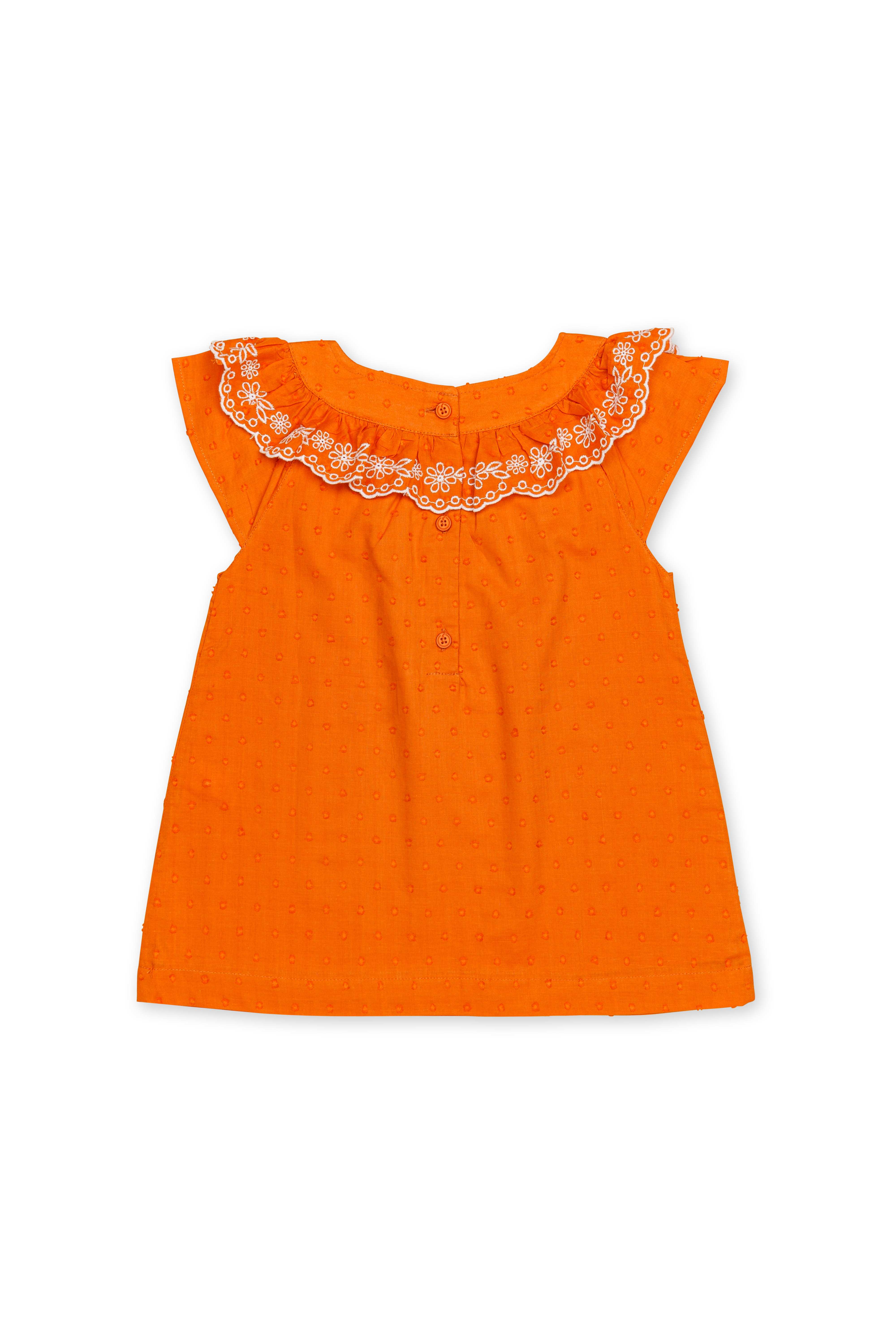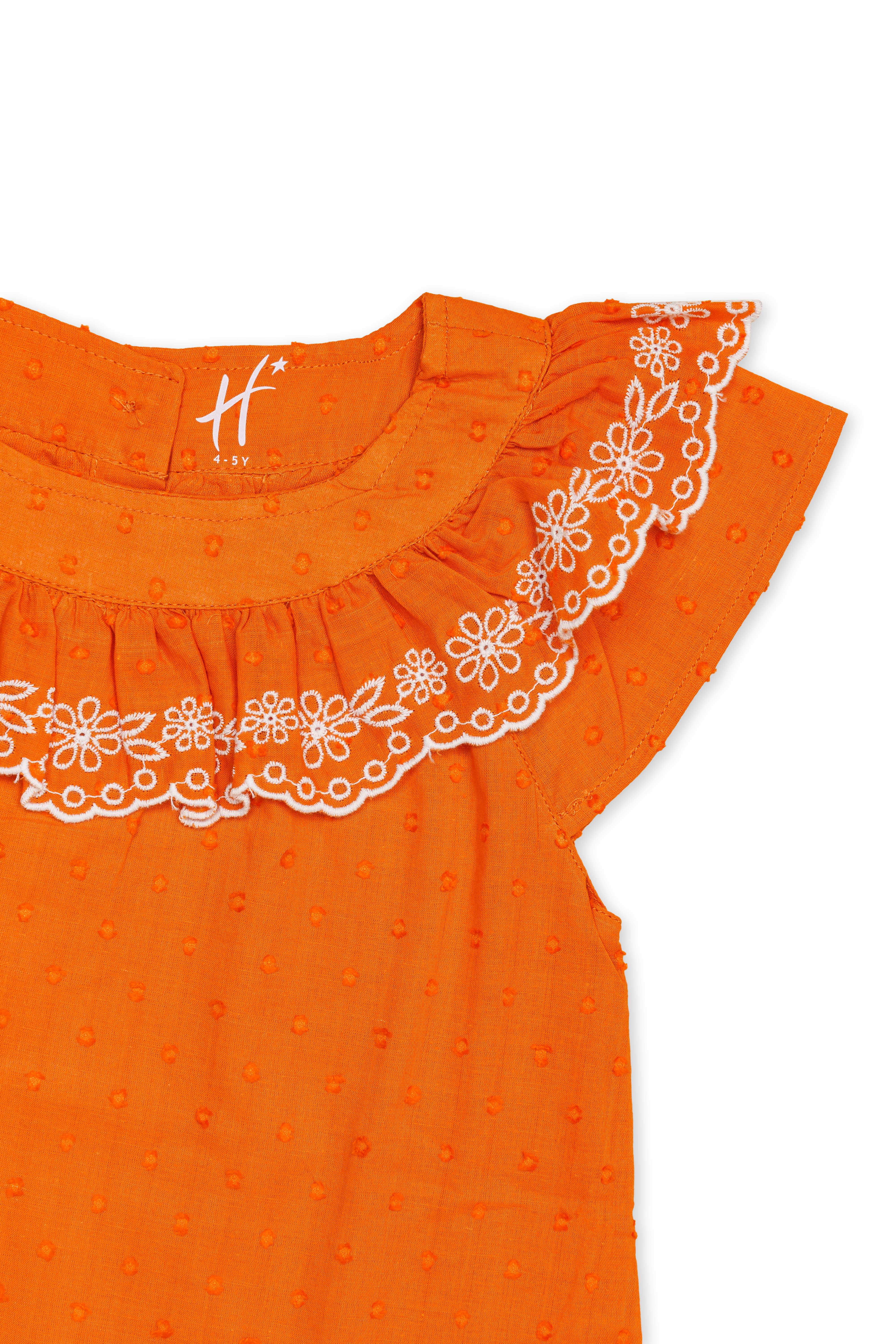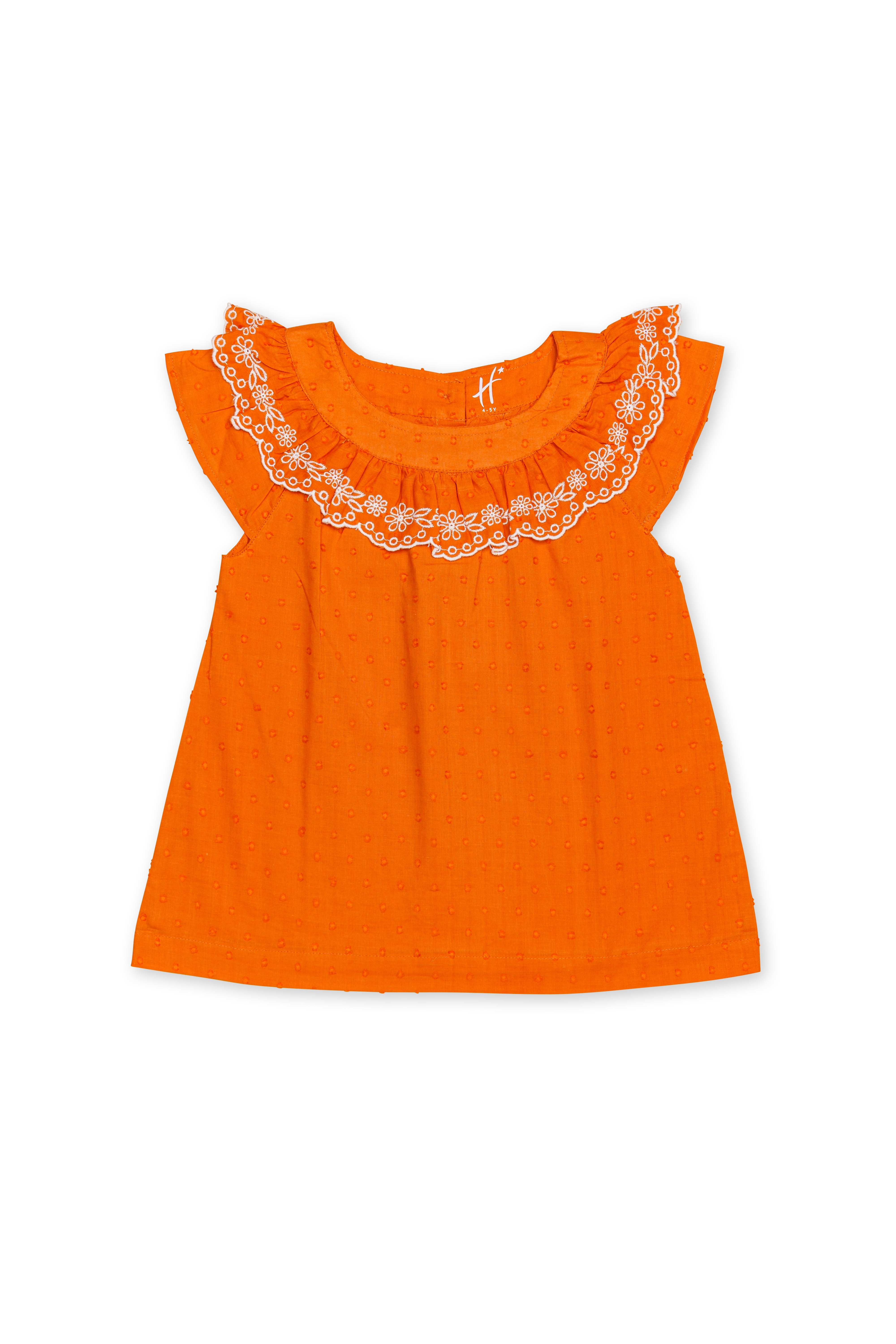 Some things never change AKA our love for flowy tops for the summers! This bright orange piece is an adorable pick to add some extra colour to your girl's closet. Made with super soft cotton, this top features a frilled neckline with short sleeves with some beautiful embroided details for your diva to flaunt. Versatile to style, mix and match this top with a variety of skirts & shorts with bright flip flops to complete the look. Shop now!