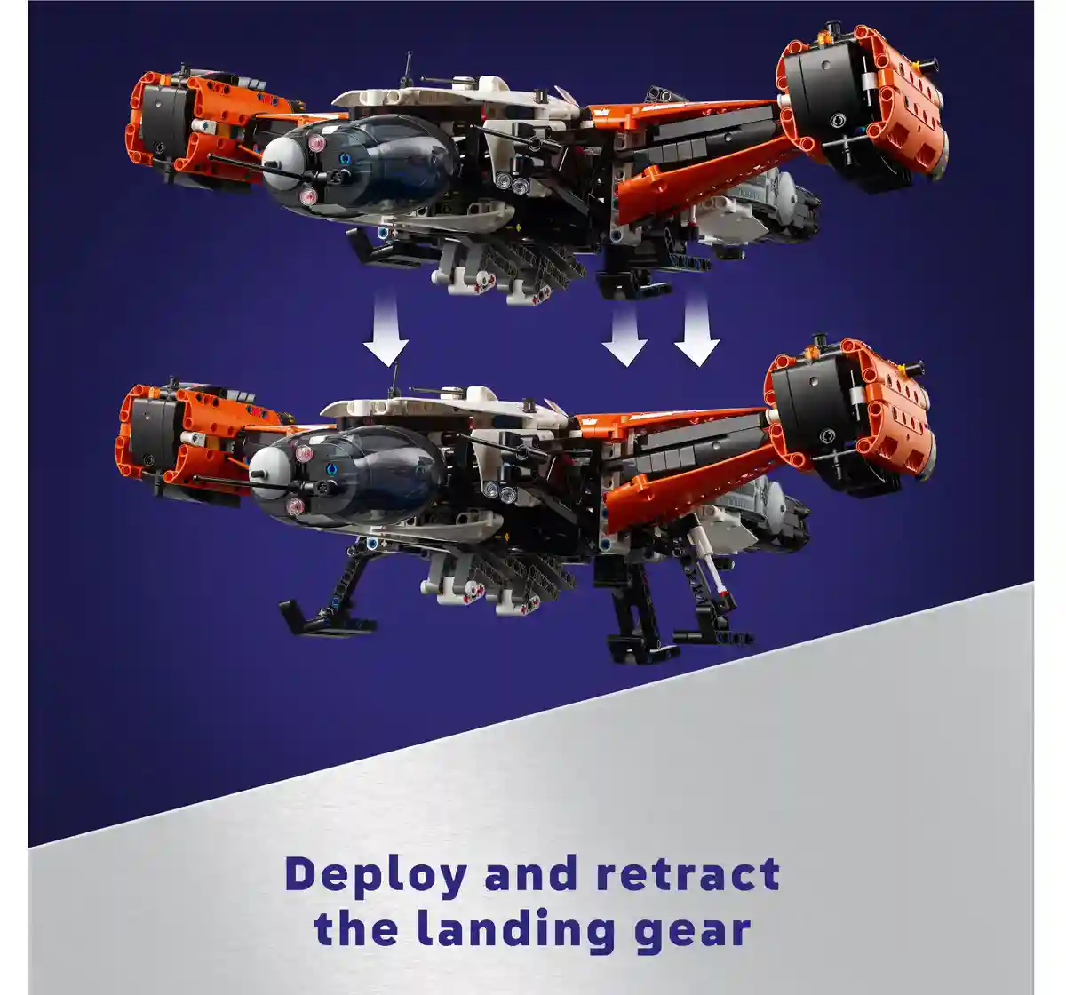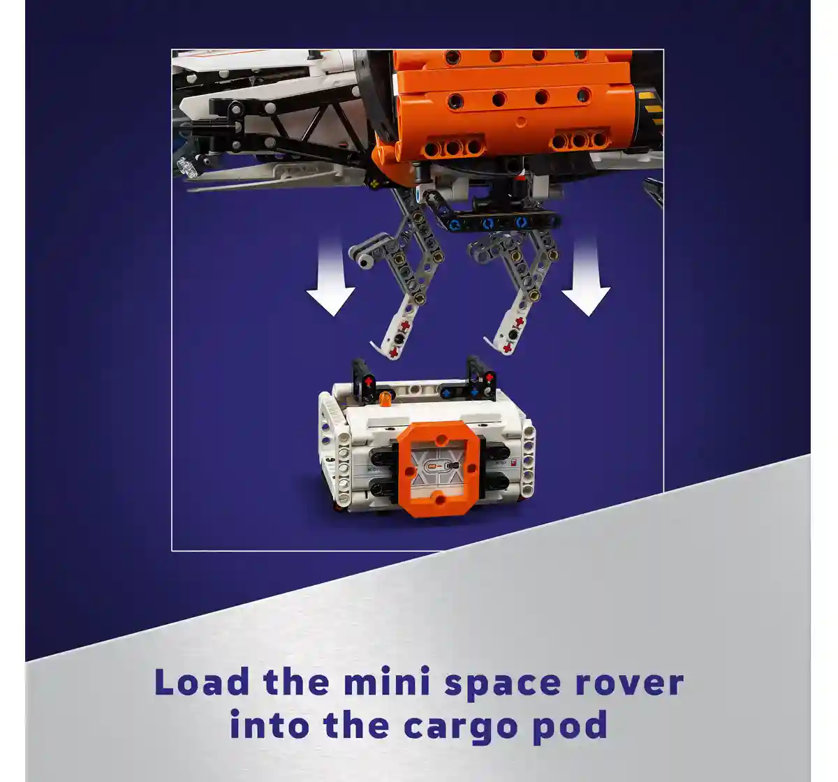 The set is packed with cool features including gears that rotate the engines, extend and retract the landing gear and lower the claw to grab the cargo pod loaded with a mini space rover. There’s even a handle on top so young space fans can swoop this futuristic spaceship around the room as they play.