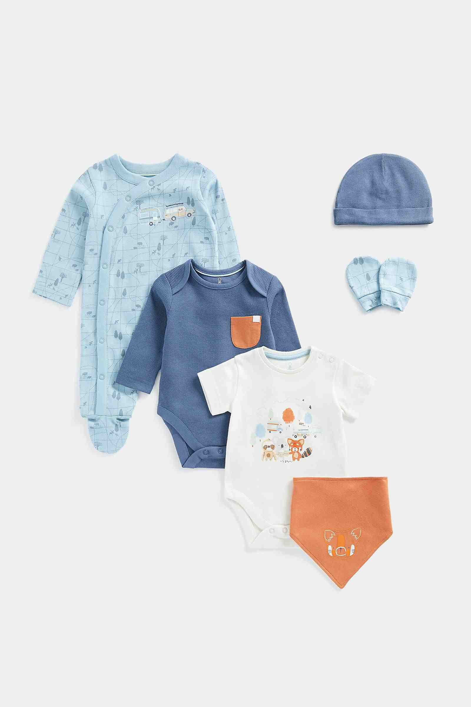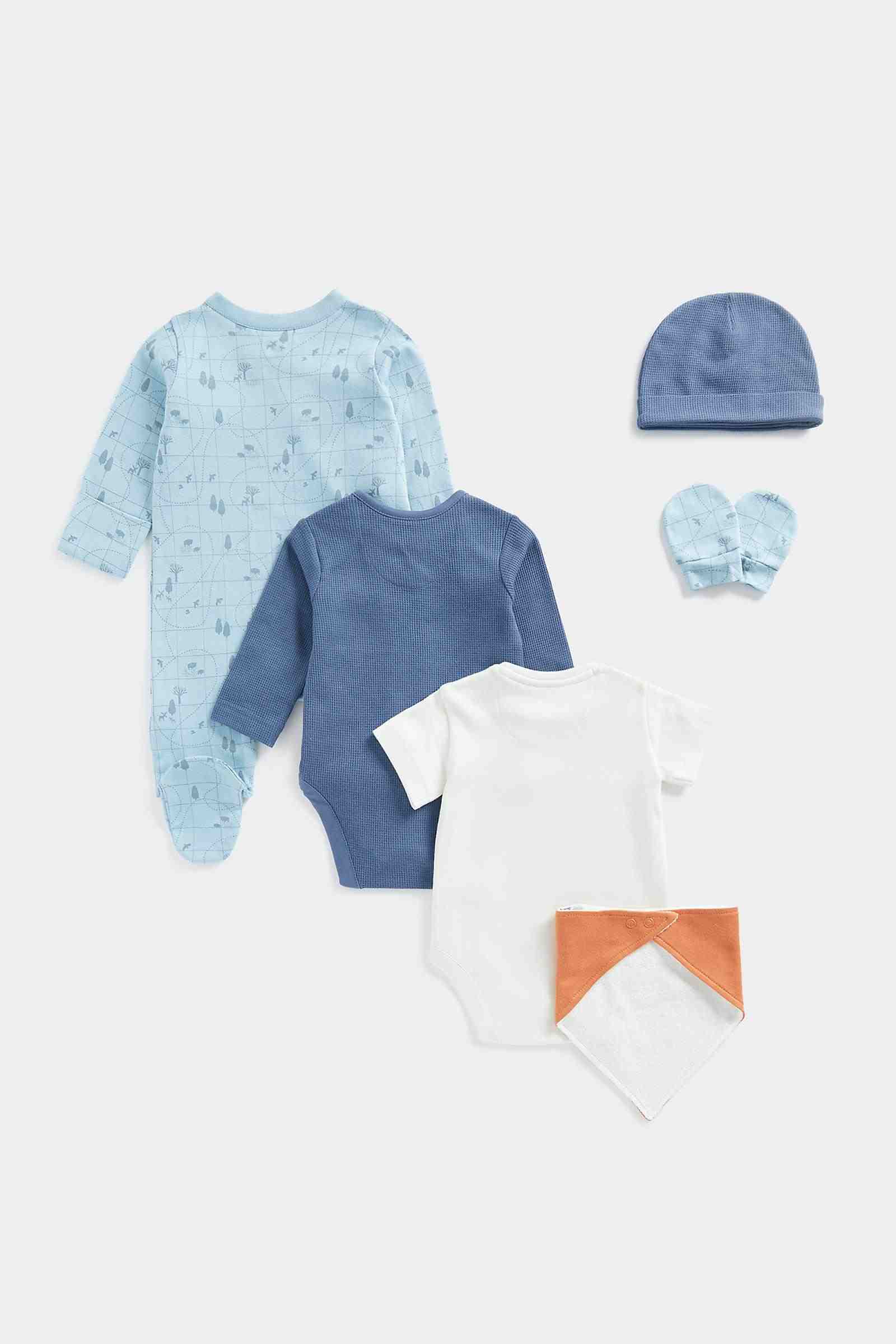 - Includes long-sleeved bodysuit, short-sleeved bodysuit, all-in-one, bib, hat and a pair of scratch mitts