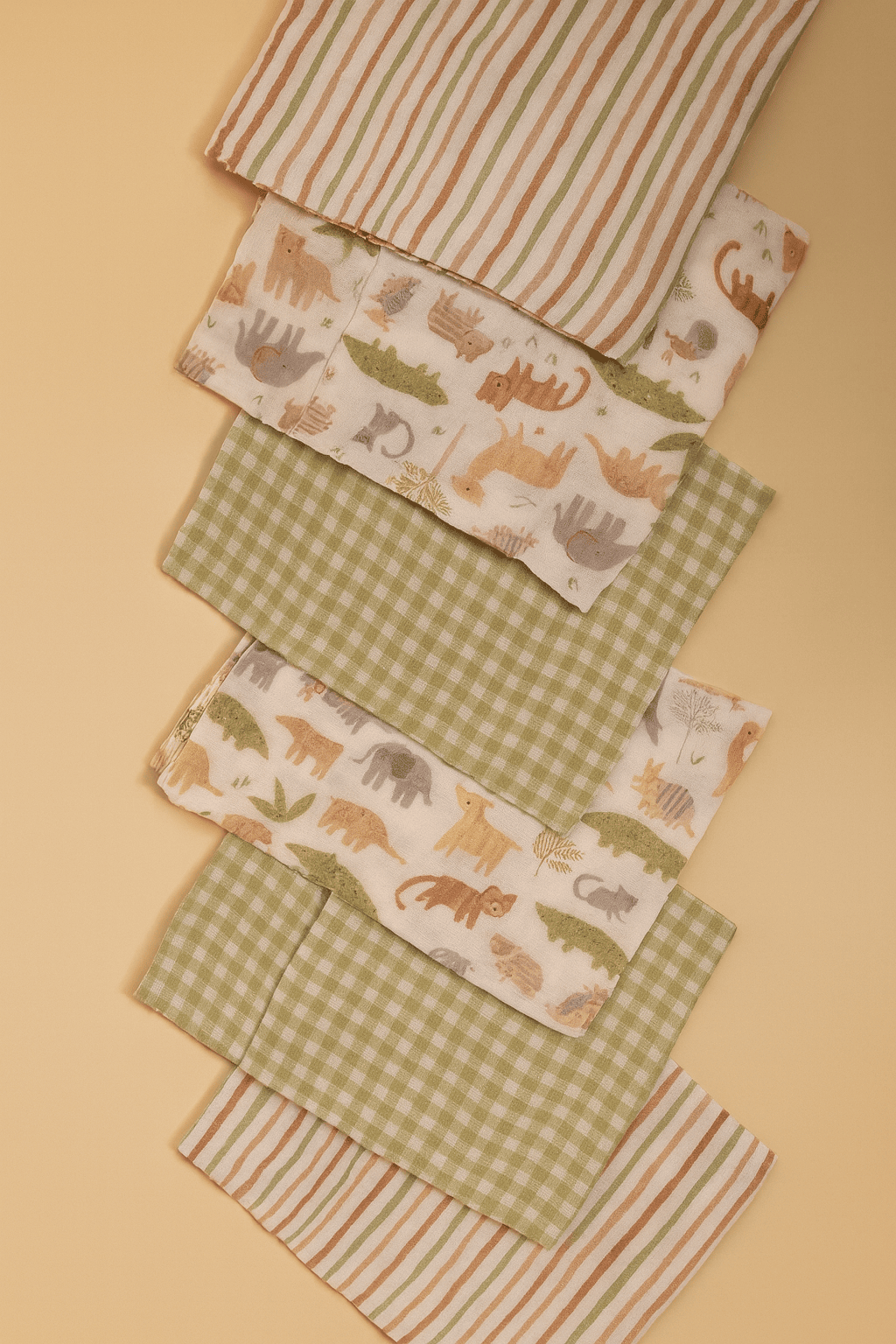 Bringing comfort and convenience together, this multicoloured muslin set for babies is designed for everyday care. Made from soft cotton, these babies' printed muslins are breathable and gentle, making them ideal for delicate baby skin. Featuring animal, striped, and checkered prints, this set adds a touch of fun and variety to daily essentials.