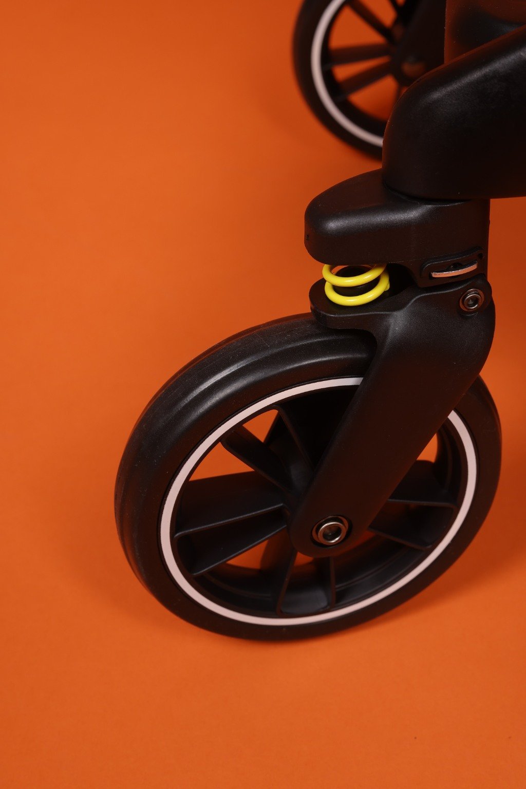 - Front wheels turn 360 degrees with spring suspension and rear wheels with double breaks