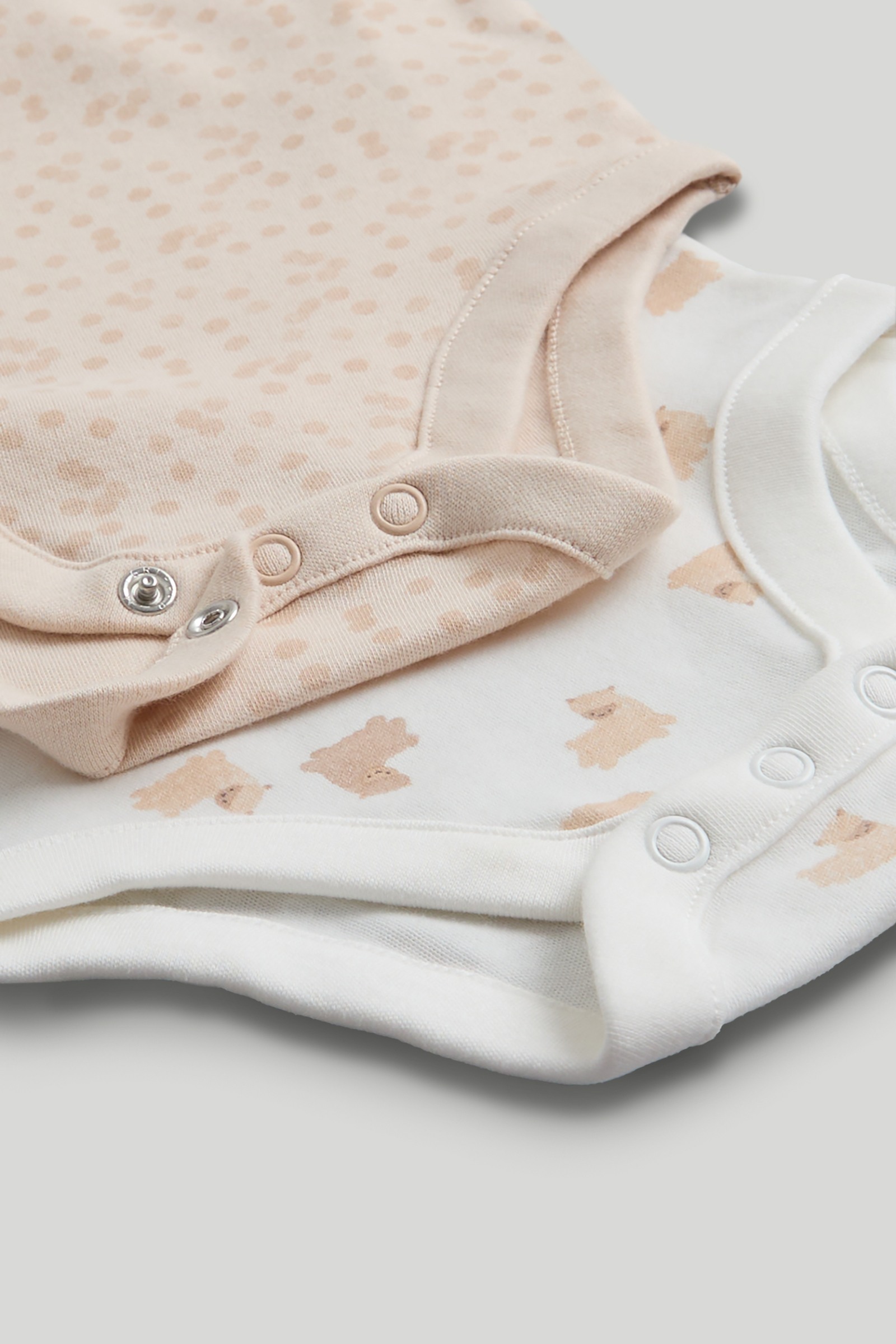 A pack of five all-in-one bodysuits in soft, natural colours. A lovely gift for a newborn, these bodysuits are a versatile and comfy addition to any babys wardrobe. Soft, breathable cotton keeps them cosy, while the envelope neck and popper fastenings make dressing a breeze.