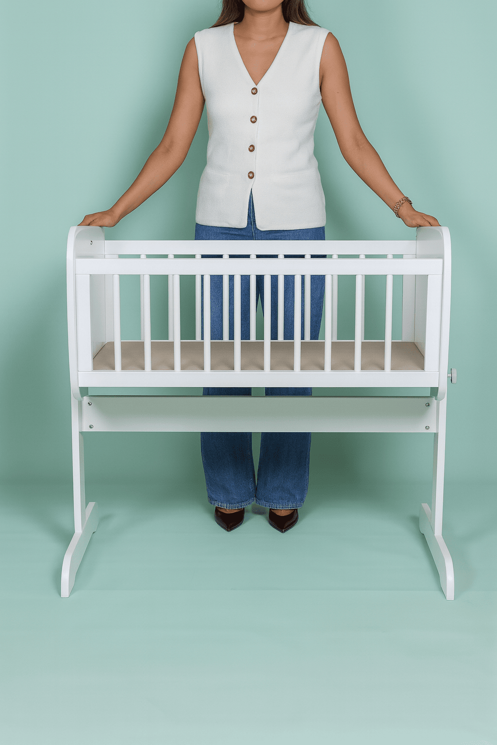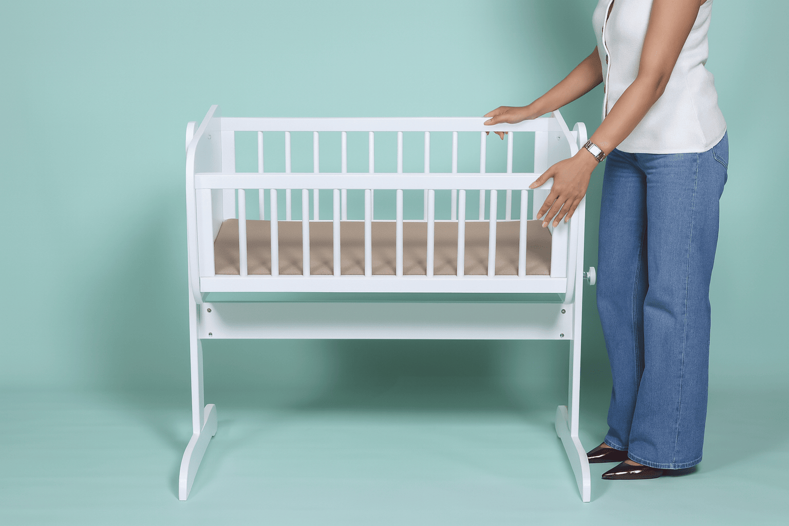Graceful and secure, this swing cradle for babies offers a cosy resting spot. The pine wood build of this cradle provides reliable strength and a natural look. Designed with an open grid frame for ventilation and stable footing for safety, it ensures comfort and calm during nap times.