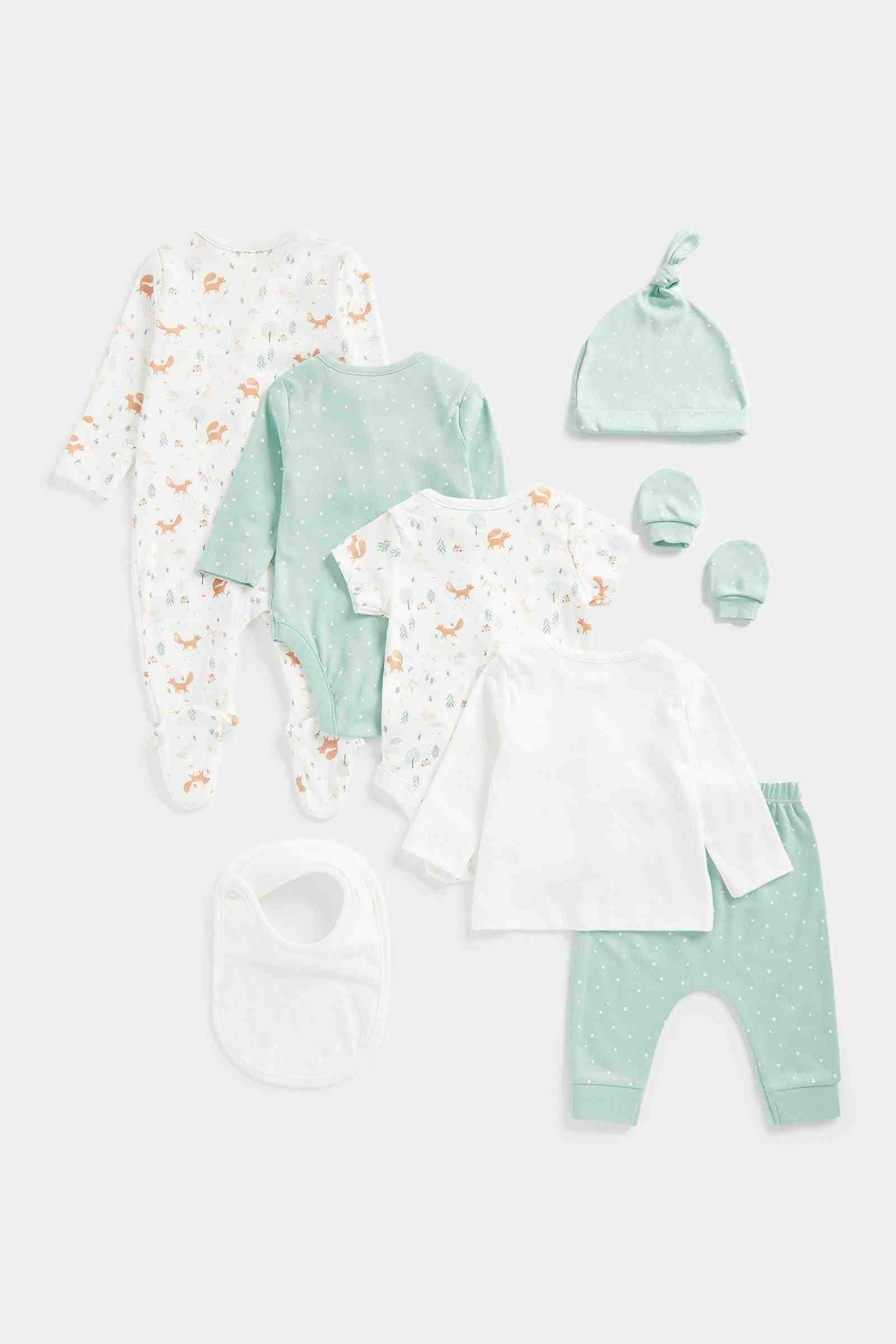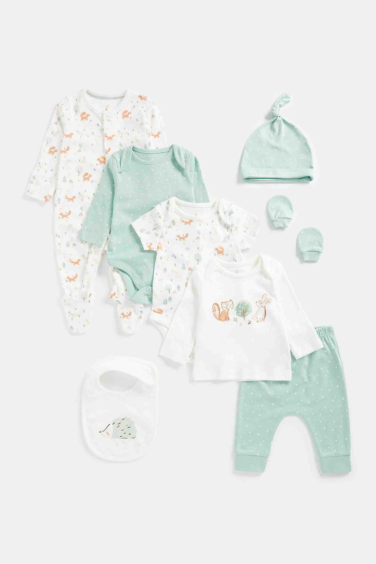- Includes long-sleeved bodysuit, short-sleeved bodysuit, sleepsuit, top, leggings, bib, hat and pair of scratch mitts