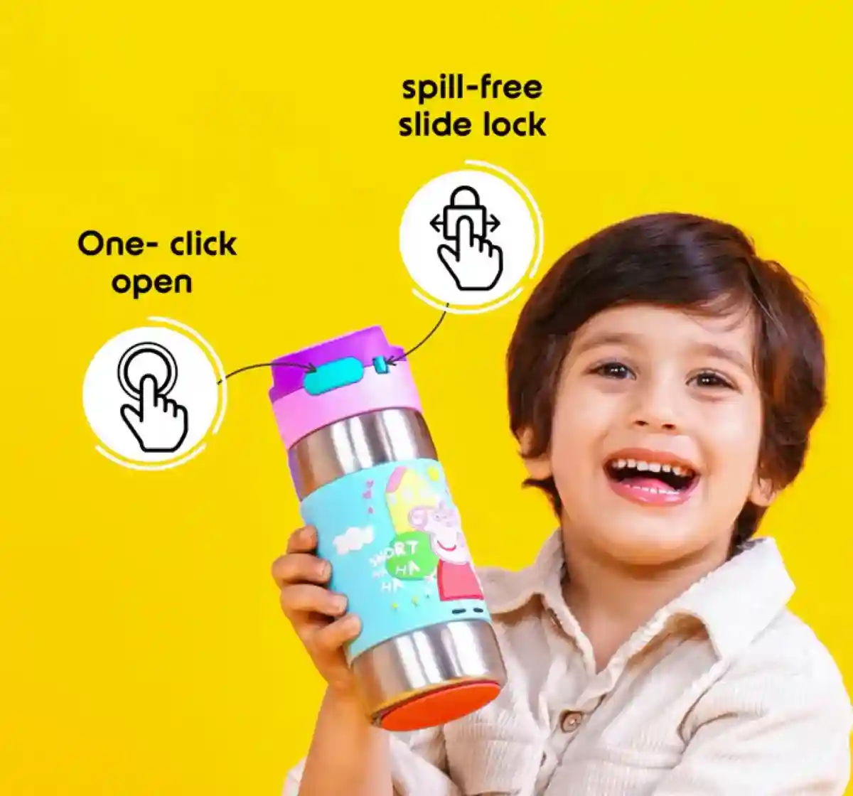 Clean Lock Insulated Stainless Steel Bottle will keep the drinks cool, even in the harshest of summers. Leaving your child with a nice cool drink all day. The Silicone band on the bottle makes it non slip and the 3D characters make it so much fun for the little ones. The bottle also features an easy carry handle made keeping the little hands in mind. The Bottle has a hygienic Clean Lock Lid which keeps the dirt and germs away from the spout.